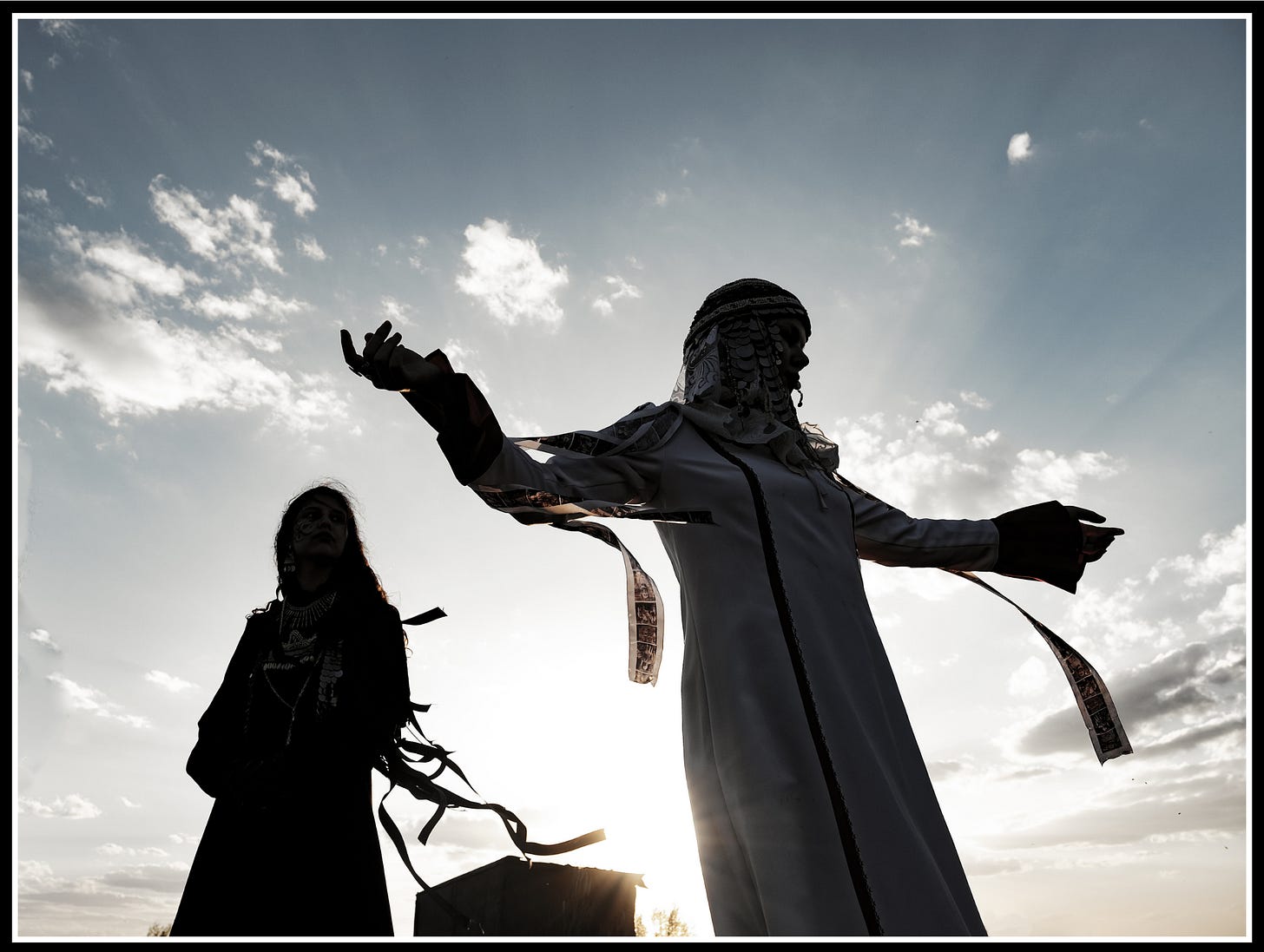 With high contrast typically captured in daylight, the Chuvash figures reenact their ancient dances and present their traditional customs based on linear bodily markings shaping the face and body similar to a feline. Their intricate dresses and jewelry contain spikes and spherical shapes, as if representing spears and shields of ancient warriors. The skillful panoramic and theatrical display of the Chuvash actors contained within the photography and films contain a remarkable nobility of a proud, mysterious, and ancient people whose story remains shrouded by remote, mountainous landscapes as the people of the steppe. Some of Nastas’ya Kydryashova’s photographs capture the various cultural musical and artistic festivals celebrating Chuvash culture. These particular photos reveal an enchanted heritage, a series of dances and poses which reflect poetic musing in historical identity rich in mysticism and celestial-like traits, as if these people were one with their environments, at one with the universe.