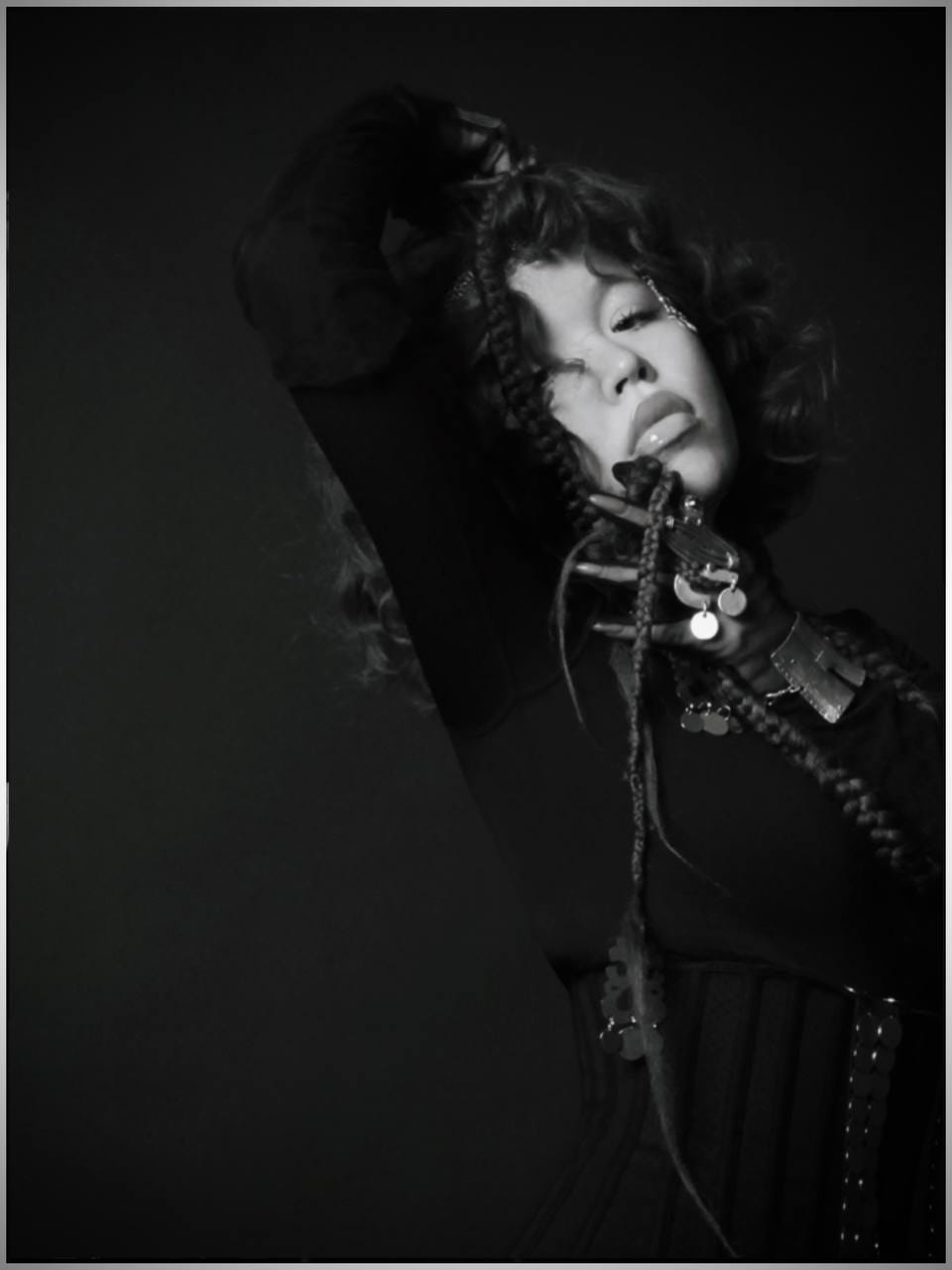 Festival V. 1 (pictured above) depicts a group of dancers and musicians engaging in cultural posture and celebration. The photograph captures an intense mystical theatrical light resembling intense daylight which brings the main dancer dominant within the space. Motioning with her linear bodily jewelry, she is frozen in a moment of hypnotic jubilee. The remaining musicians act as ‘anchors’ towards the positioning against the raising of the arms of the primary dancer.